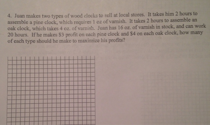 Juan makes two types of wood clocks to sell at local stores. It takes him 2 hours to assemble a pine clock, which requires 1 oz of varnish. It takes 2 hours to assemble an oak clock, which takes 4 oz. of varnish. Juan has 16 oz. of ... View Doc